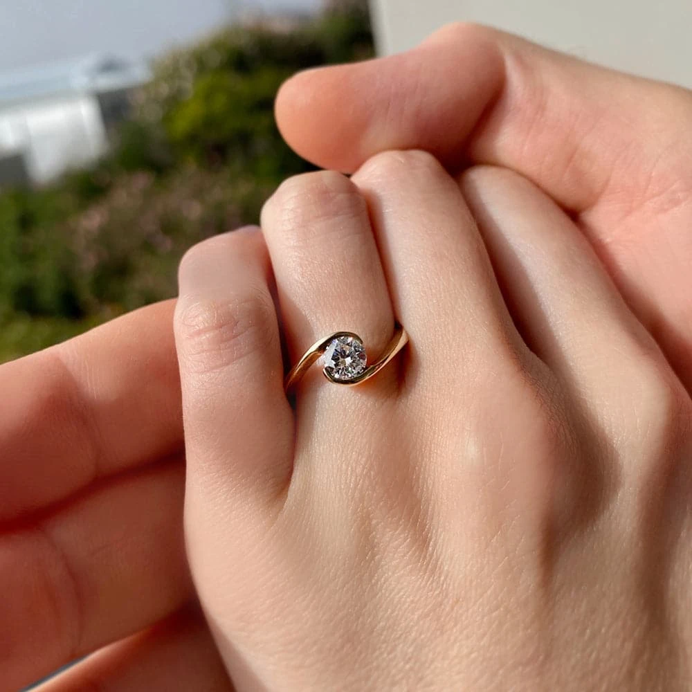The Modern Solitaire Ring is a stunning piece of jewellery that features a 0.5 ct. round brilliant cut Tru-Diamond™ set in a sleek bezel setting. The unique design allows the diamond to appear as though it is floating, creating a captivating visual effect that highlights the stone’s brilliance.