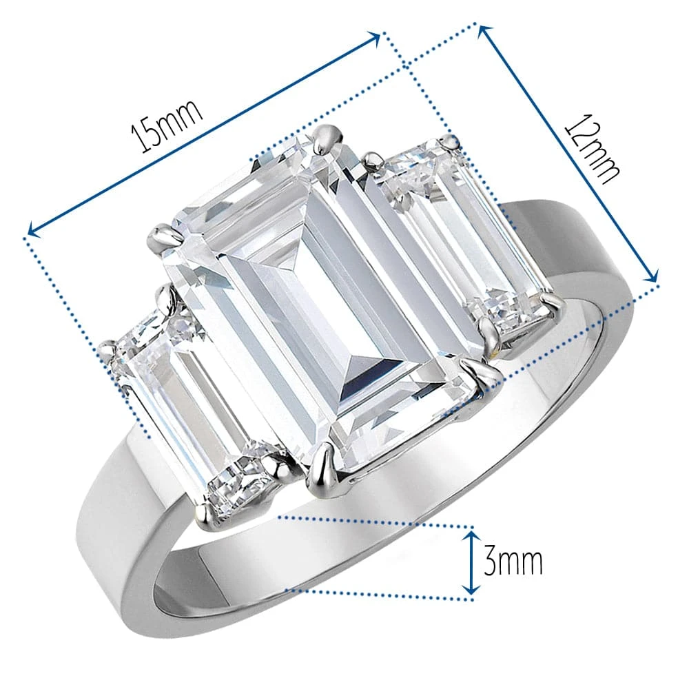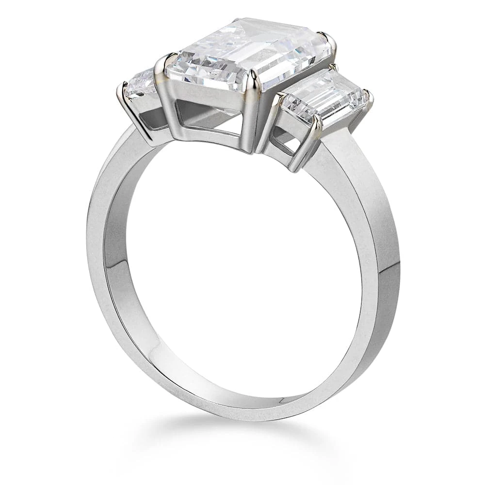 For a ring that is guaranteed to stop traffic, yet possesses all the classic sophistication associated with a three stone design, look no further than our Impressive Emerald Cut Trilogy Ring. Its awe inspiring eleven carats of emerald cut Tru-Diamonds™ define the very essence of glamour.