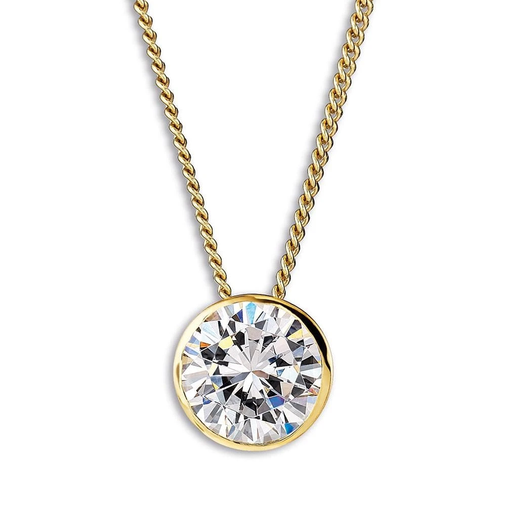 The Bezel Solitaire Pendant is a delicate piece that combines the traditional Solitaire with a unique twist of having the 2 ct. Solitaire Tru-Diamonds™ stone surrounded by an elegant setting.