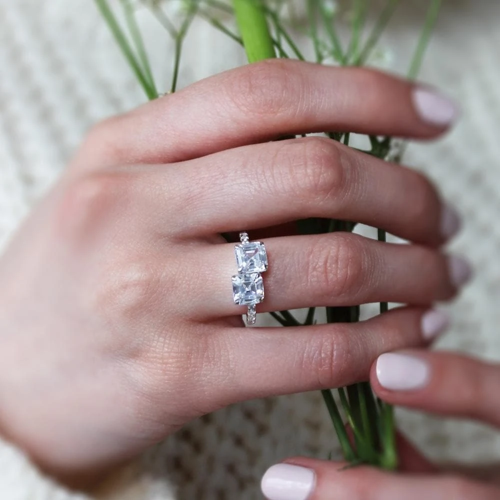 The By Your Side Ring boasts two magnificent asscher cut Tru-Diamonds™ for an impressive focal point, expertly set with 10 smaller stones for added sparkle.