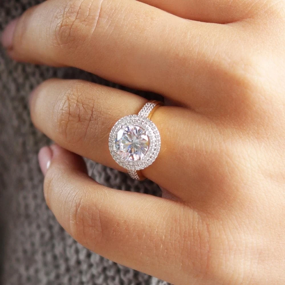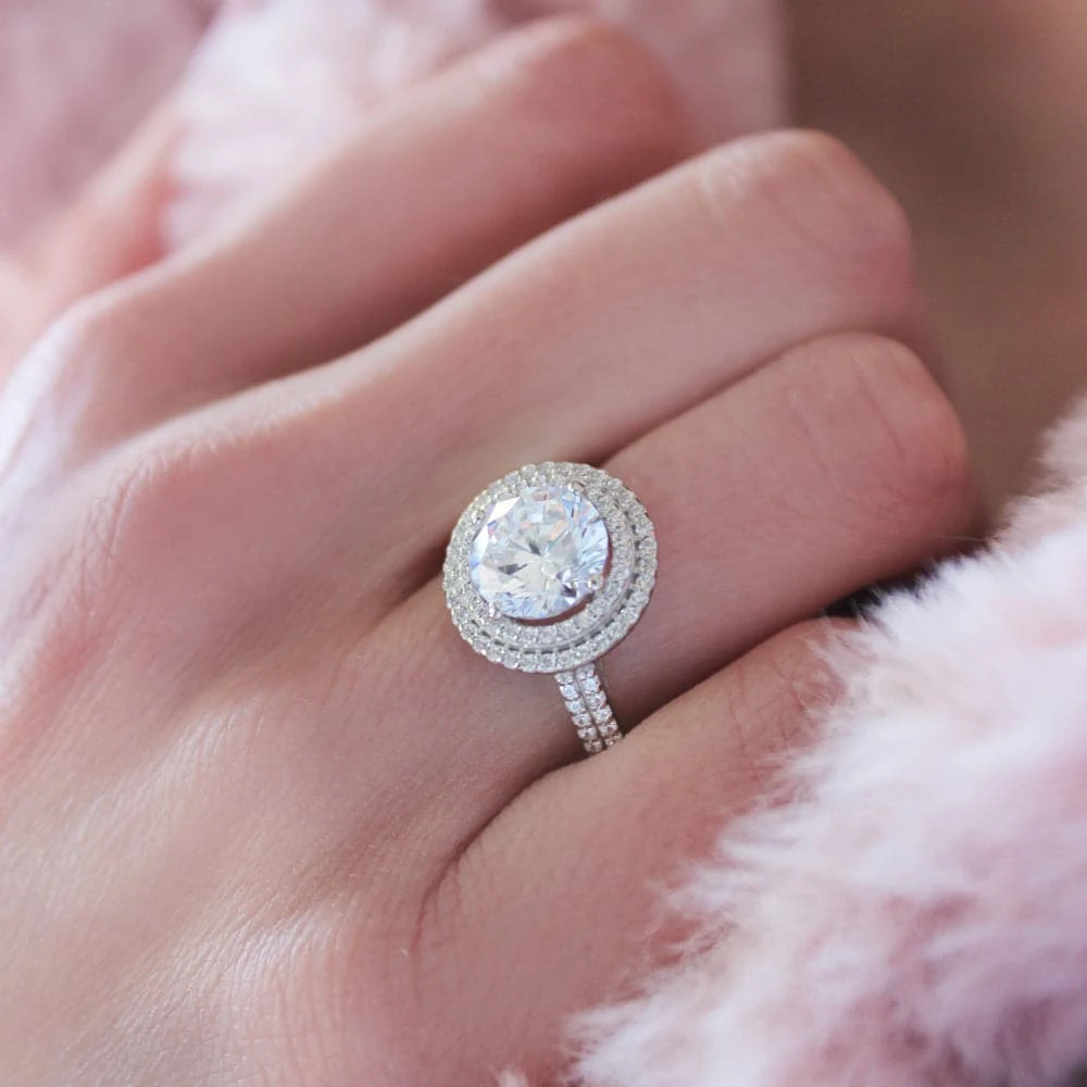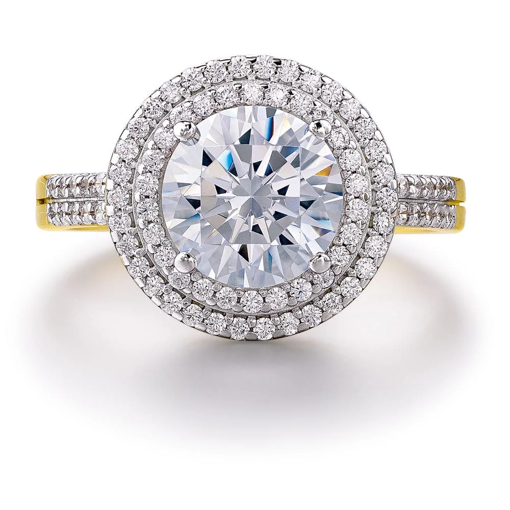 Double the halo, double the sparkle. Our Double Halo Ring features a 2 ct. flawless Tru-Diamonds™ centre stone, surrounded by a double halo, giving it extraordinary brilliance – so expect compliments! It’s an ultimate show-stopper!