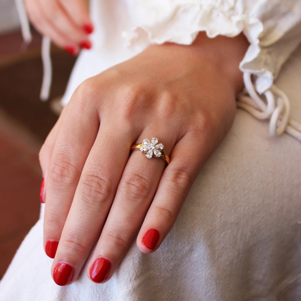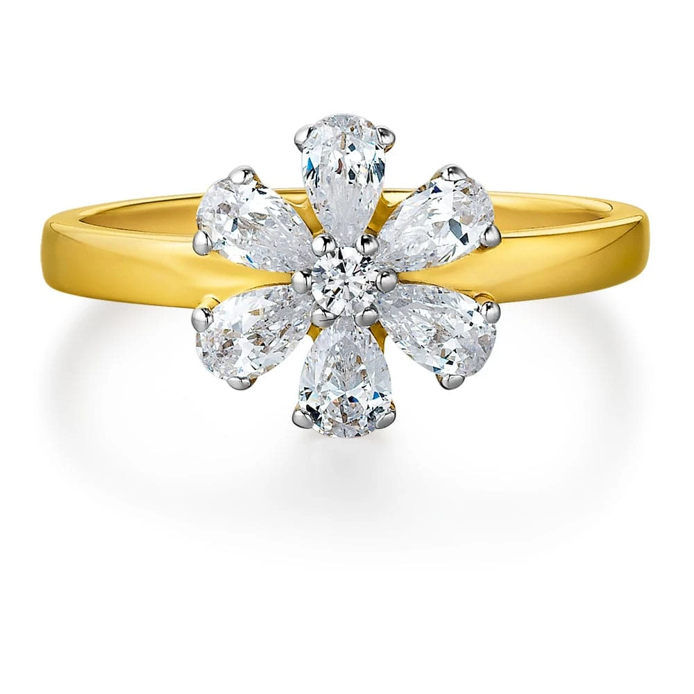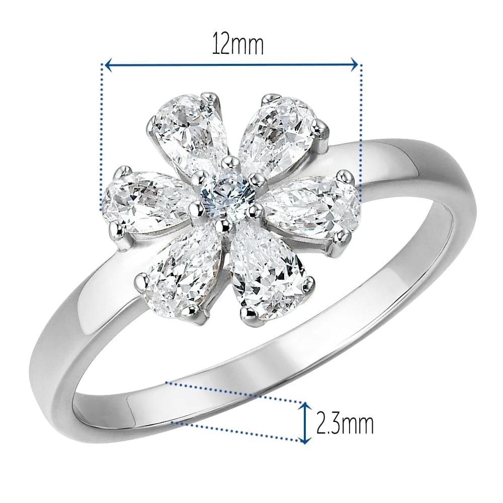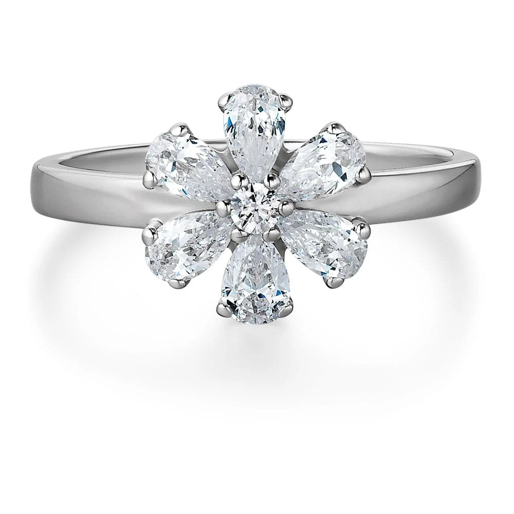 For vibrant women who love fun this Forget Me Not Ring is a piece that signifies joy. 1 round Tru-Diamonds™ gem is surrounded by 6 pear shaped stones forming this 1.85 ct. t.w. blossom.