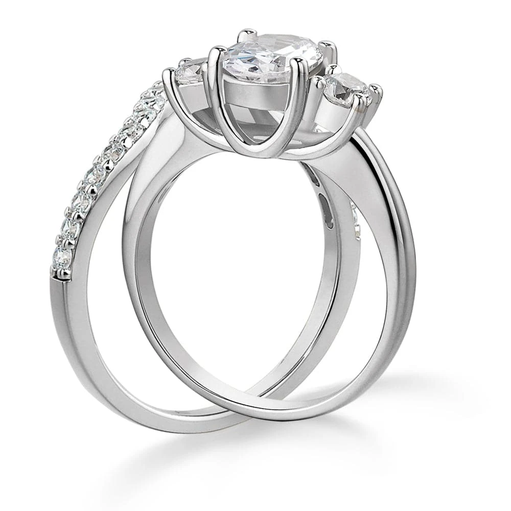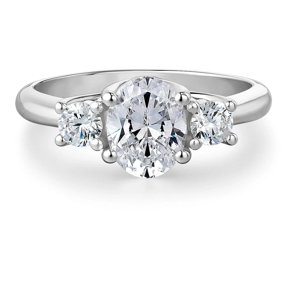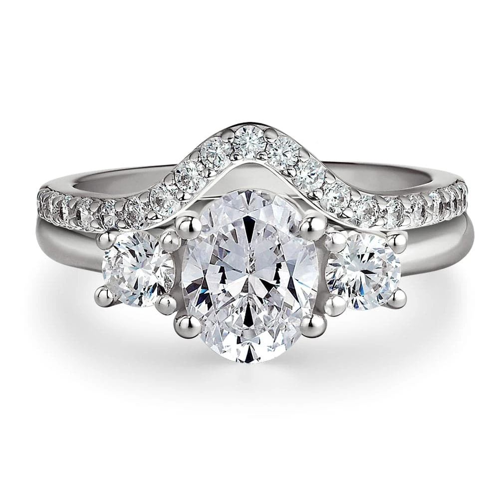 Celebrate romance with this glamorous trilogy ring featuring a dome eternity ring in a soft wishbone shape. The 2ct Oval Tru-Diamonds™ gem flanked with 2 smaller brilliant cut stones on either side is complemented with the 19 glistening Tru-Diamonds™ gems that have been perfectly cut and set in a channel.