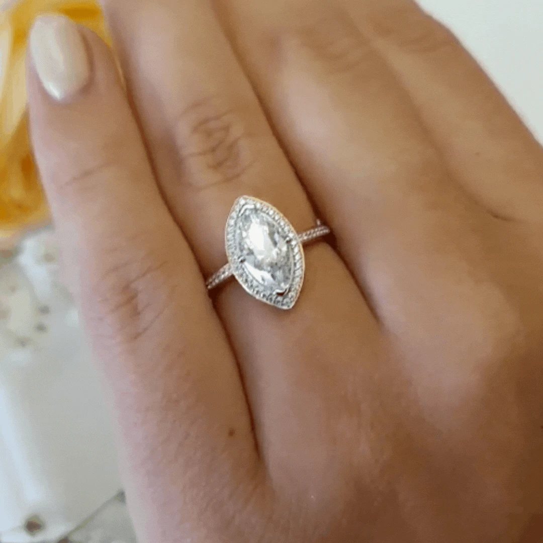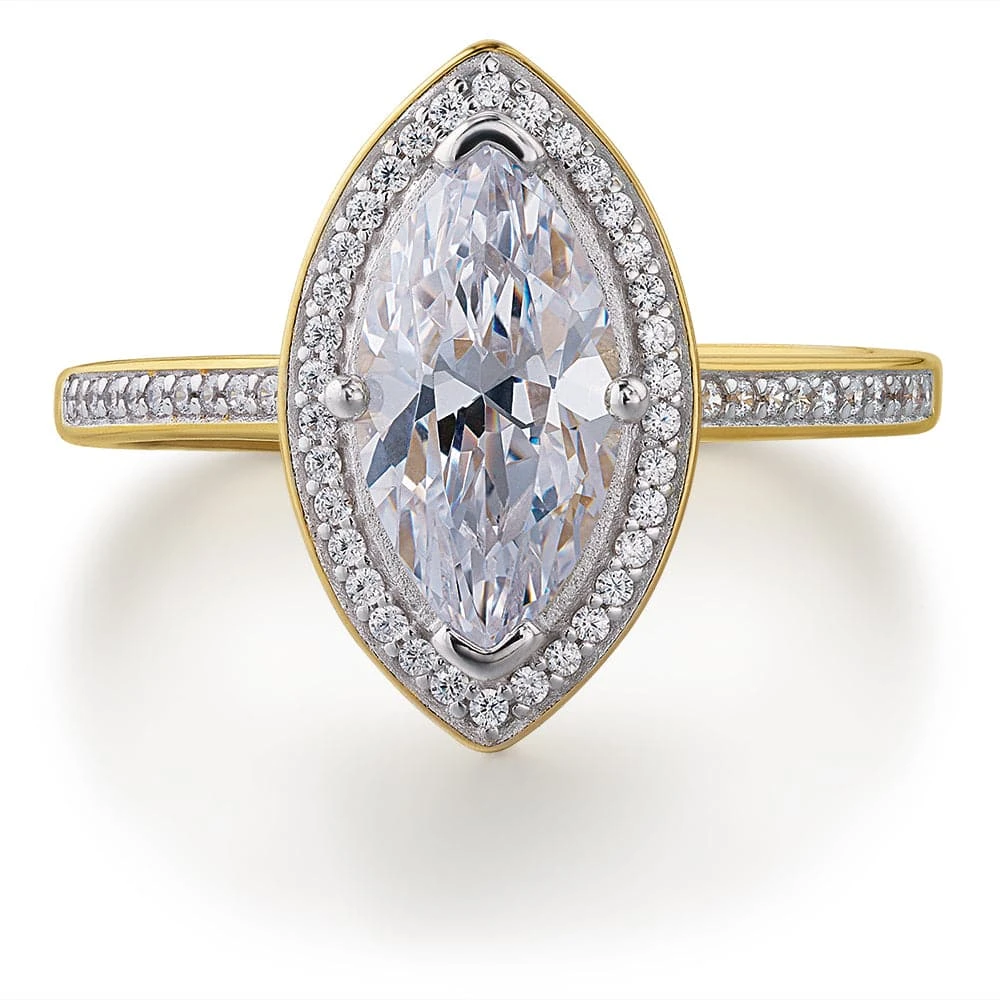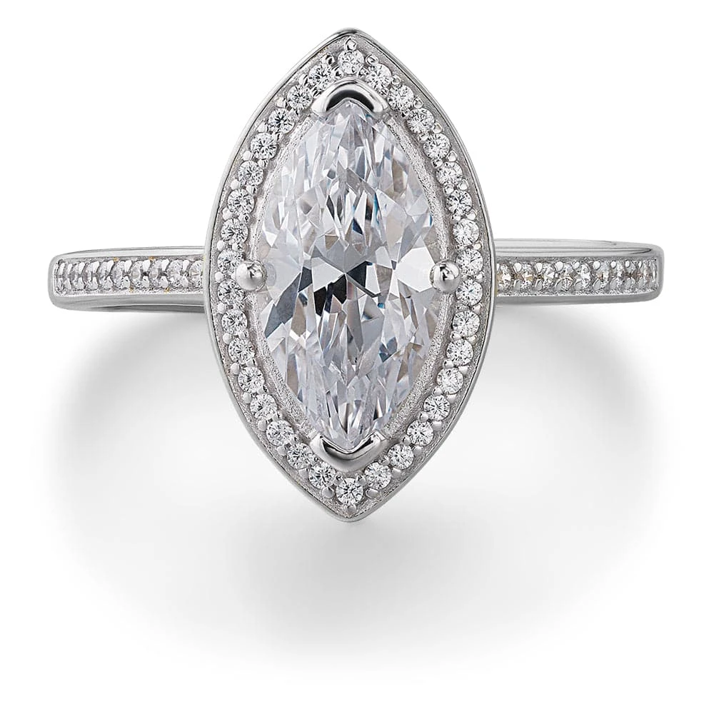 This classic ring showcases a stunning halo of sparkling Tru-Diamonds™ gems surrounding a 1.25 ct. Marquise centre stone, making it a truly exquisite piece of jewellery for any jewellery collection.