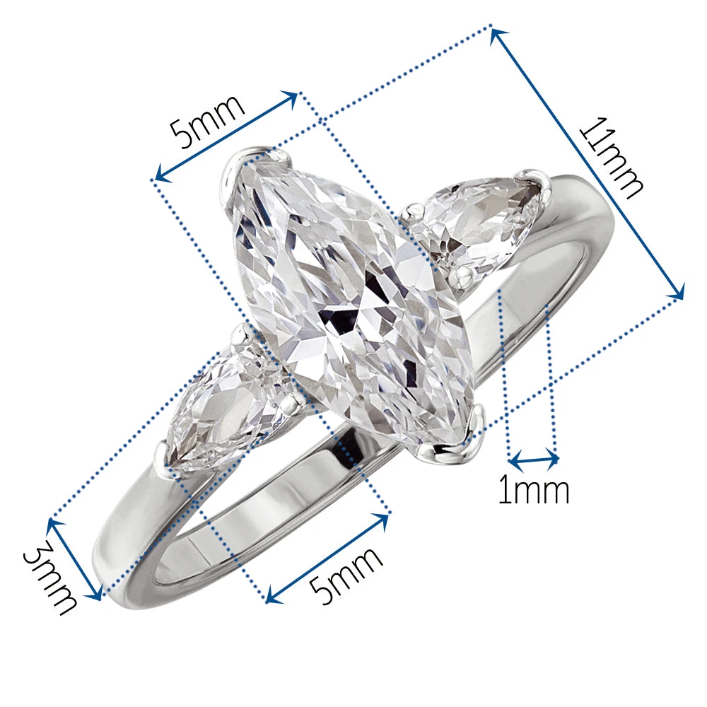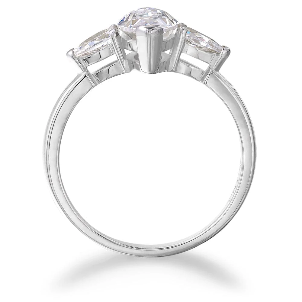 A chic diamond silhouette that handles light almost as perfectly as a round cut diamond; this is what the experts say about the Marquise Cut Stone. Our Marquise Cut Trilogy Ring has a perfectly symmetrical 1.50 ct. Marquise Cut centre stone, complemented by 2 pear shaped gems – a modern take on a noble design.