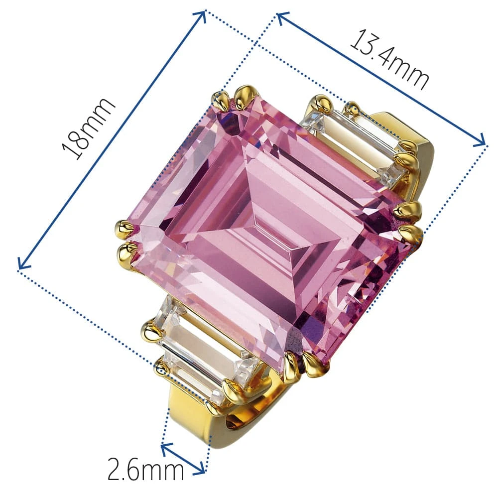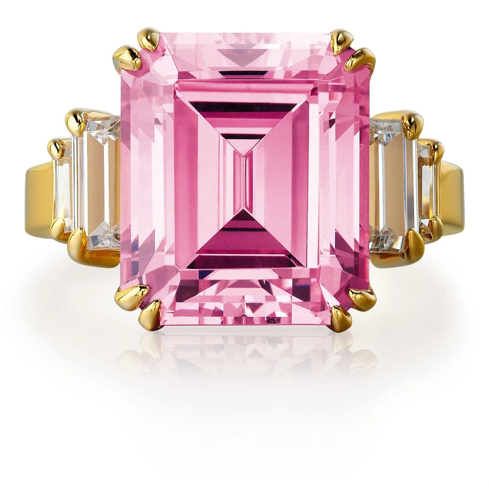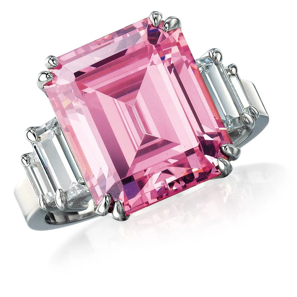 The Pink Millions Ring is our gorgeous replica of the spectacular pink diamond ring that broke all records when it was sold at Sotheby’s Magnificent Jewels Auction in October 2019 for $19,900,000. The original 14.23 carat vivid pink diamond was set in white gold with ice white trapezoid-cut diamonds on either side. Pink diamonds are well known to be highly valued. The Cape Town Diamond Museum says pink diamonds are among the most valuable coloured diamonds in the world and may cost up to 20 times the price of their white diamond equivalents. The Pink Millions Limited Edition Replica Ring closely resembles the original. In fact, the pink Tru-Diamonds™ centre stone may be, visually, superior to the original due to the fact that the lab-grown process results in gemstones with none of the internal flaws or cloudiness that is present in, even high grade, mined diamonds.