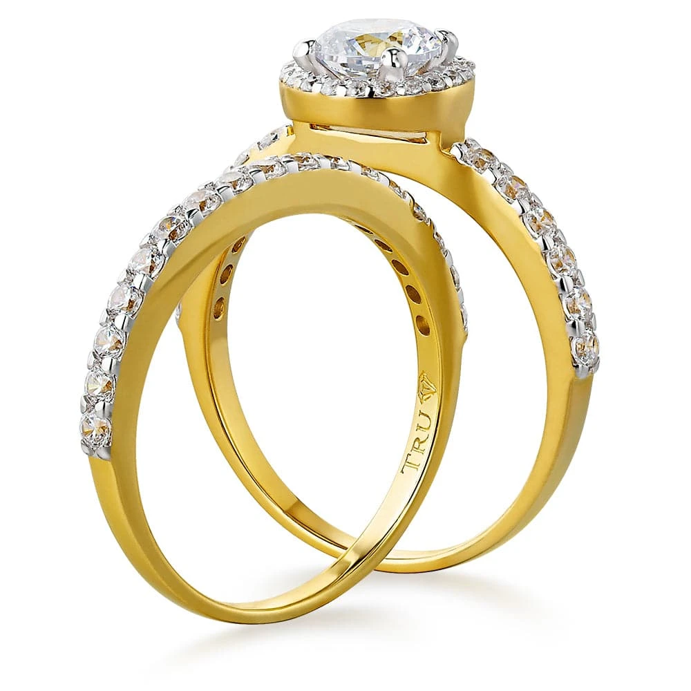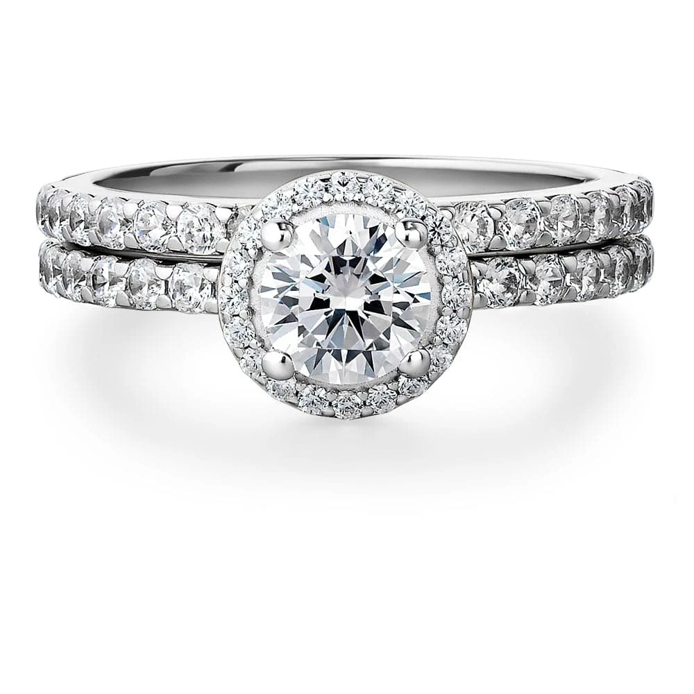 With a fine halo encircling its 1 ct. Tru-Diamonds™ centre gem, the Posh Solitaire Ring Set creates a magnificent focal point supported, by a delicately encrusted band and accompanying eternity ring.