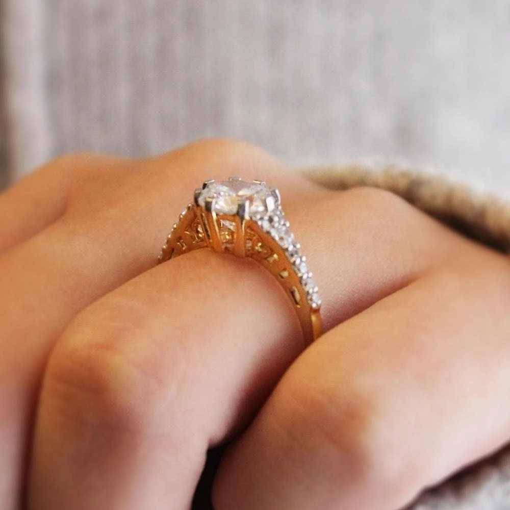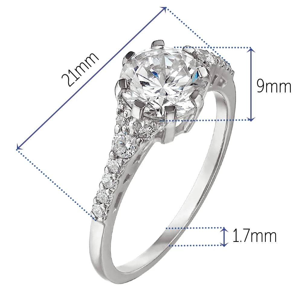 An eight-clawed centre setting and a trellised band perfectly display the 2 ct. Tru-Diamonds™ gem featured in the Queen’s Engagement Ring. This striking jewel, being our tribute to the iconic ring Prince Philip Mountbatten of Greece bestowed on Princess Elizabeth in 1947, is based on the design the prince himself created with diamonds taken from his mother’s tiara and the help of Philip Antrobus, a renowned London jeweller of the time. Now you can share in this lovely part of royal history whenever you wear this elegant ring.