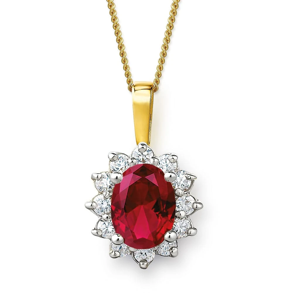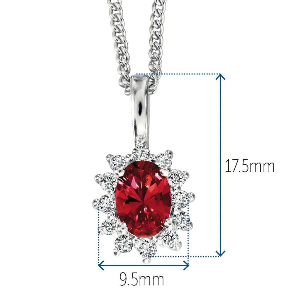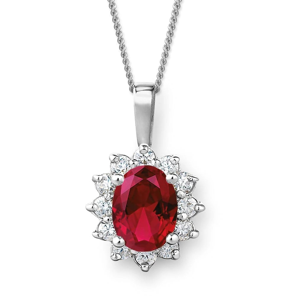 The Royal Tru-Ruby Pendant epitomizes graceful extravagance. The magnificent oval Tru-Ruby is surrounded by 14 shimmering, pure ice white Tru-Diamonds™ gems.