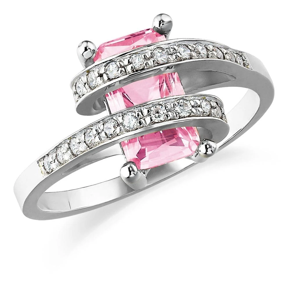 Our Swirl of Romance Ring embodies flawless femininity in this uniquely innovative design. With a total weight of 3.9 carats clear and pink Tru-Diamonds™ stones, the rosy centre stone is embraced by a cross-over ribbon of pavé set brilliance. Spoil yourself or a special someone with this beautiful ring and they won’t be disappointed.