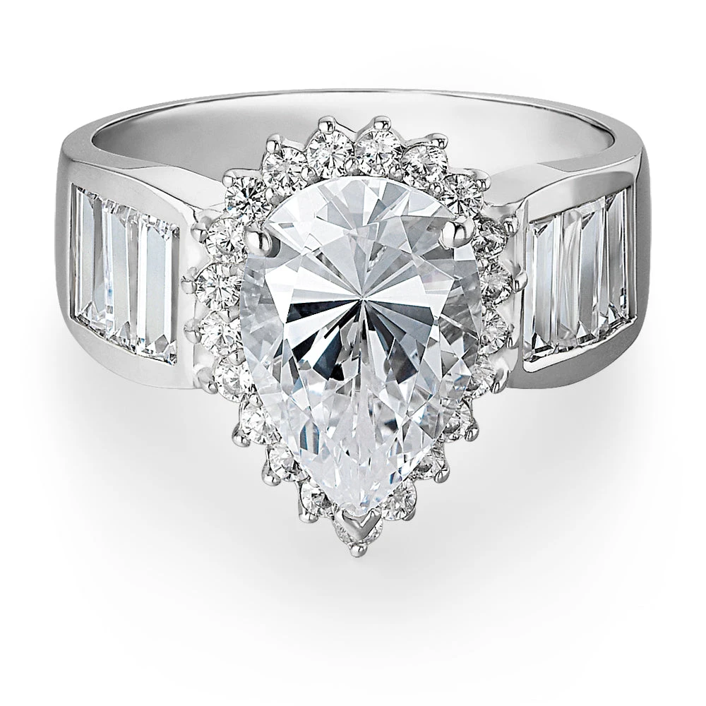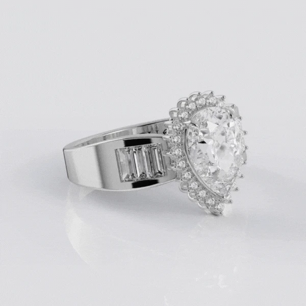 The Judy Garland Ring, an enchanting tribute to the timeless elegance and magnetic allure of the iconic actress, exudes a blend of classic sophistication and contemporary flair. At its heart lies a breathtaking 3.5 carat pear cut Tru-Diamond, reminiscent of the dazzling lights of Hollywood’s golden era. Accompanied by a halo of delicate Tru-Diamonds™, inspired by Garland’s iconic roles, each Tru-Diamonds™ gem sparkles with the same effervescence that captivated audiences worldwide during her magical portrayal of Dorothy Gale in “The Wizard of Oz.” Finally, the ring is shouldered with three baguette cut Tru-Diamonds™ gems on each side, commemorating the six awards Judy Garland received during her life.