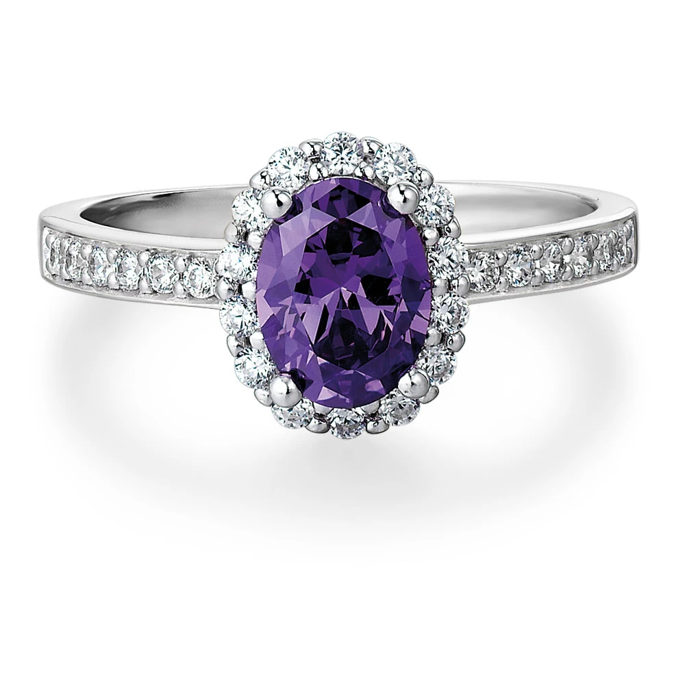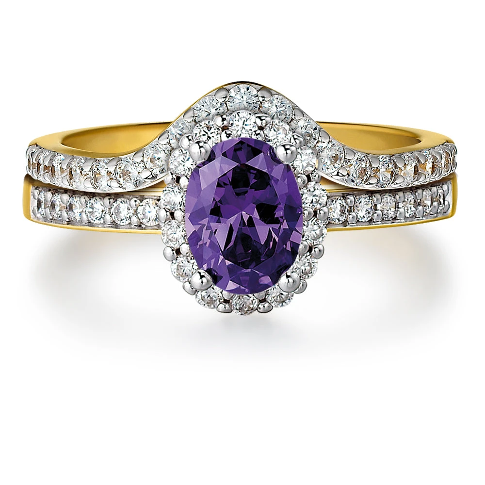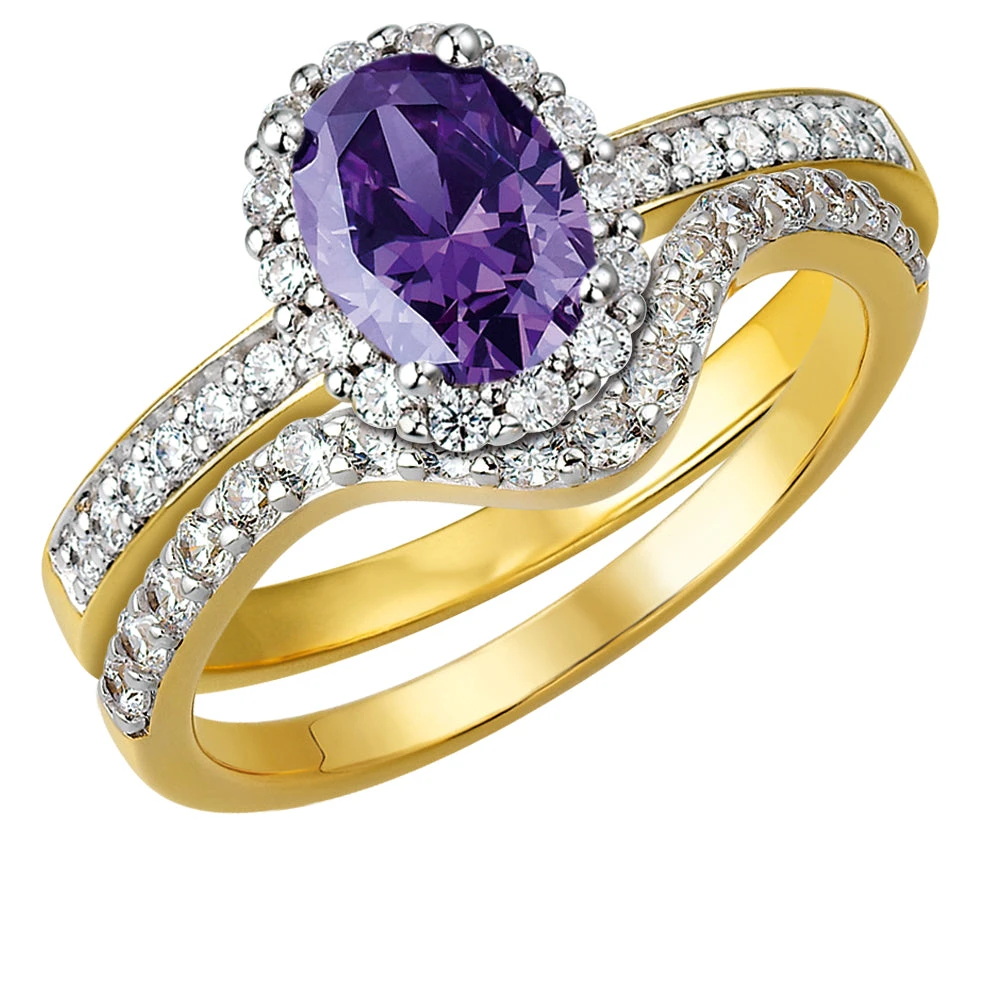 A simplistic set of elegance that is composed of our timeless Tru-Amethyst Cincature Ring and Dome Eternity ring. The 1.5 ct. oval cut Tru-Amethyst centre stone with a slender, eternity style band is completed with the soft wishbone shape that has 19 glistening Tru-Diamonds™ gems that have been perfectly cut and set in a channel.