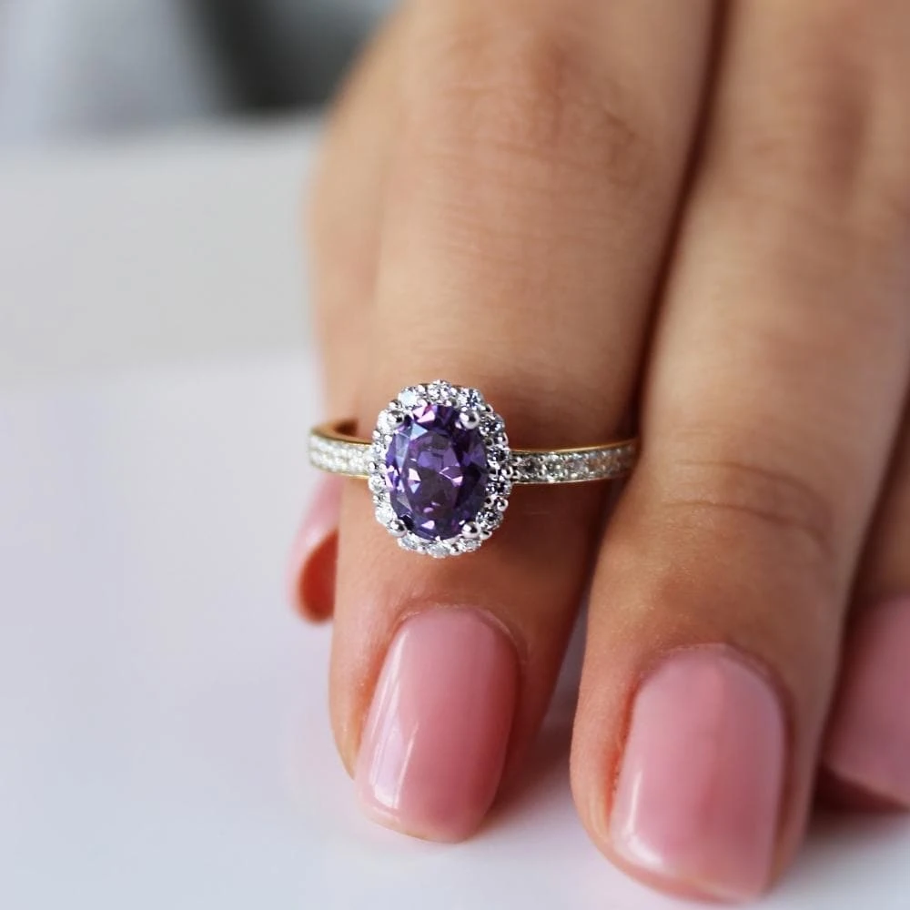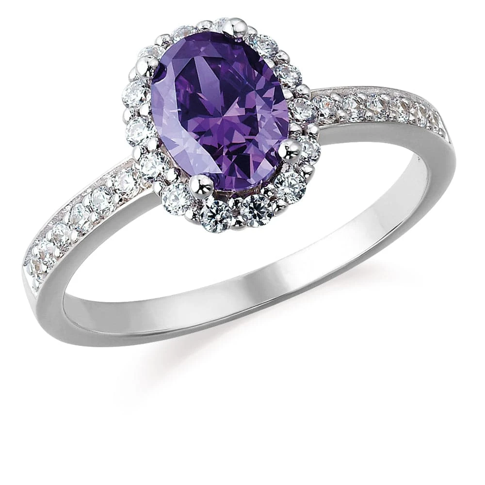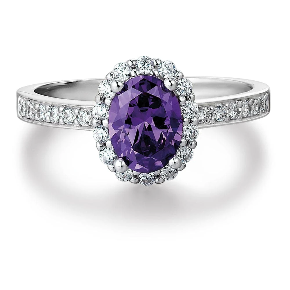 Our timeless Cincature Ring showcases an elegant halo of Tru-Diamonds™ framing a larger 1.5 ct. oval cut Amethyst Tru-Diamonds™ centre stone with a slender, eternity style band completing the design without competing for attention.