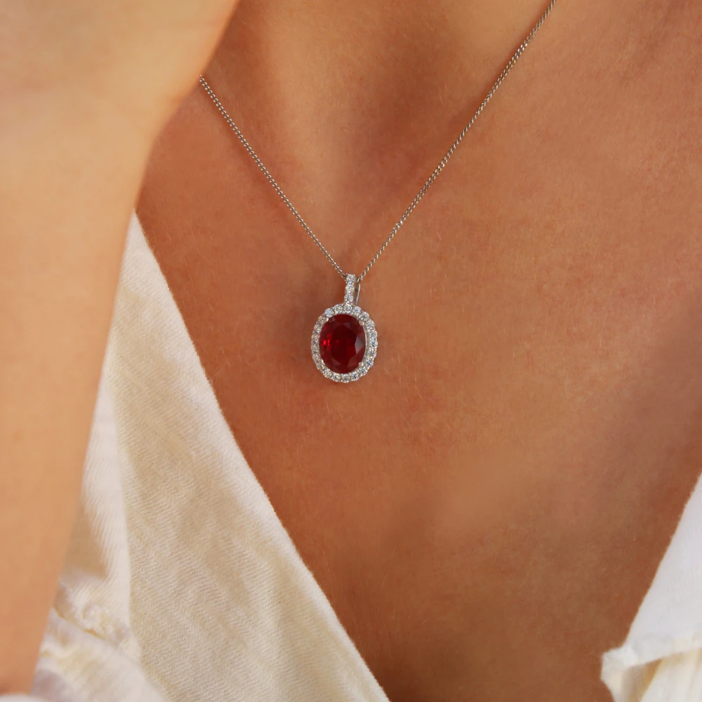 Dazzling, memorable and elegant, our timeless Tru-Ruby Cincature Pendant showcases an elegant halo of Tru-Diamonds™ gems framing a 2.5 ct. oval cut Tru-Ruby centre stone. Our Tru-Ruby Cincature Pendant reflects superior craftsmanship and elegance you’re guaranteed to love.