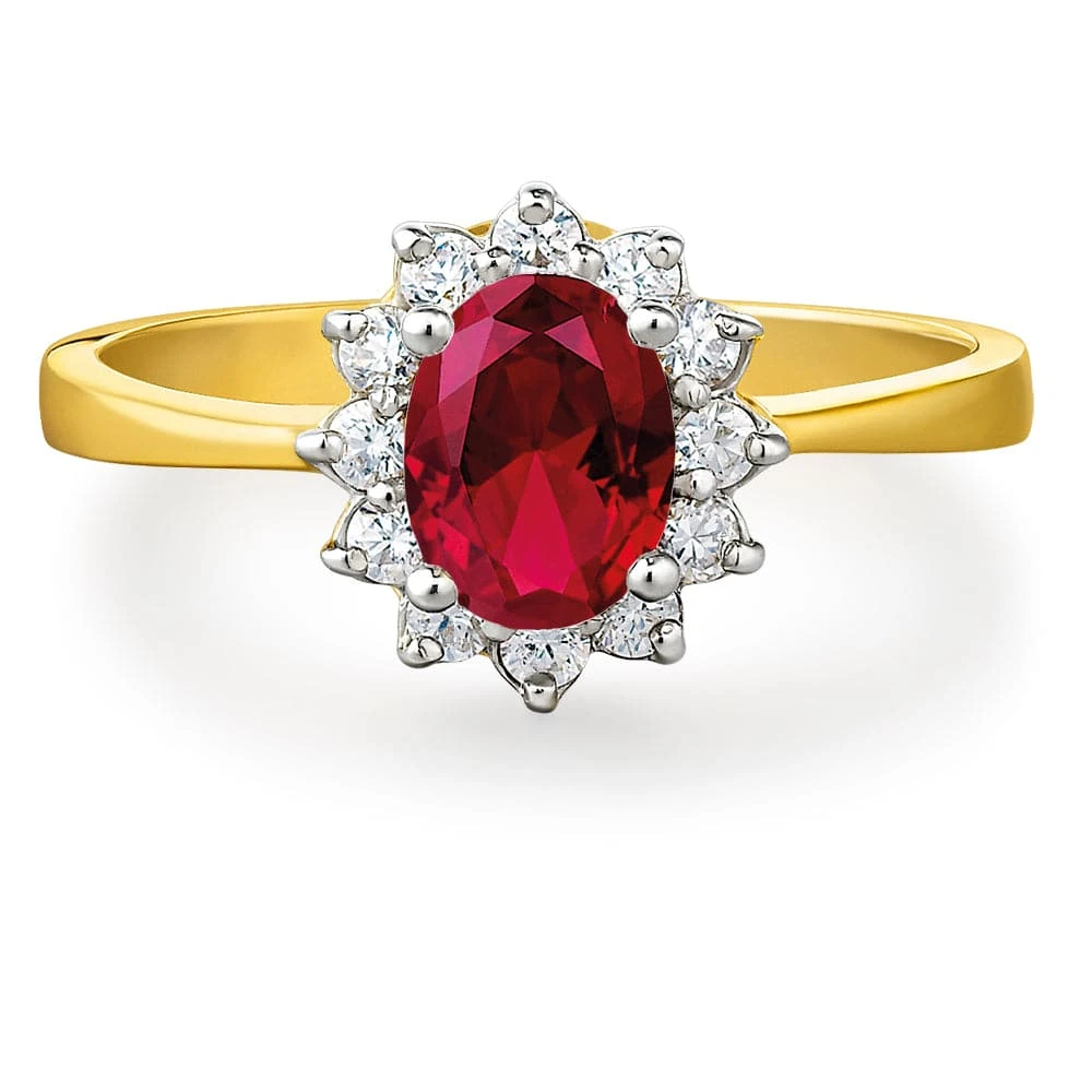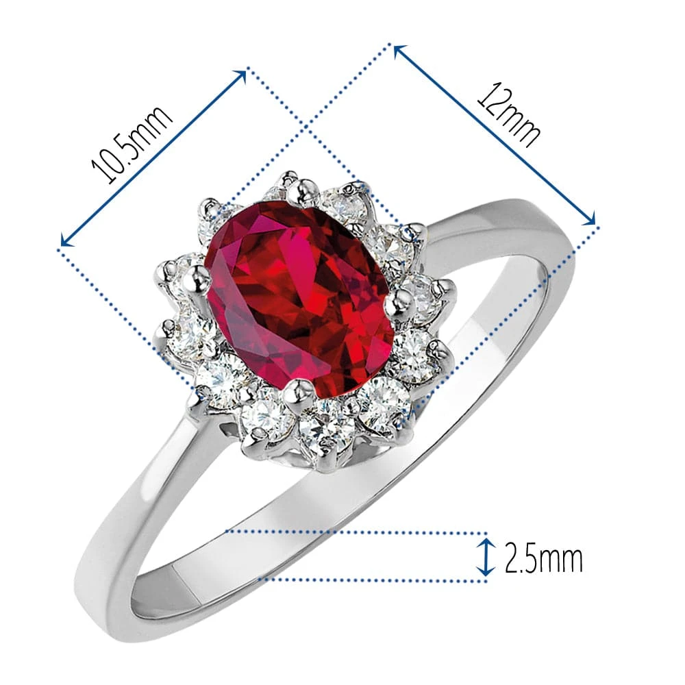 With its well-proportioned claw-set cluster and tapered band, the charming design of the Ruby Cluster Ring creates a perfect backdrop for its striking 0.75 carat oval-cut Tru-Ruby centre stone. A cluster of flawless Tru-Diamonds™ stones adds the finishing touch of this timeless ring.