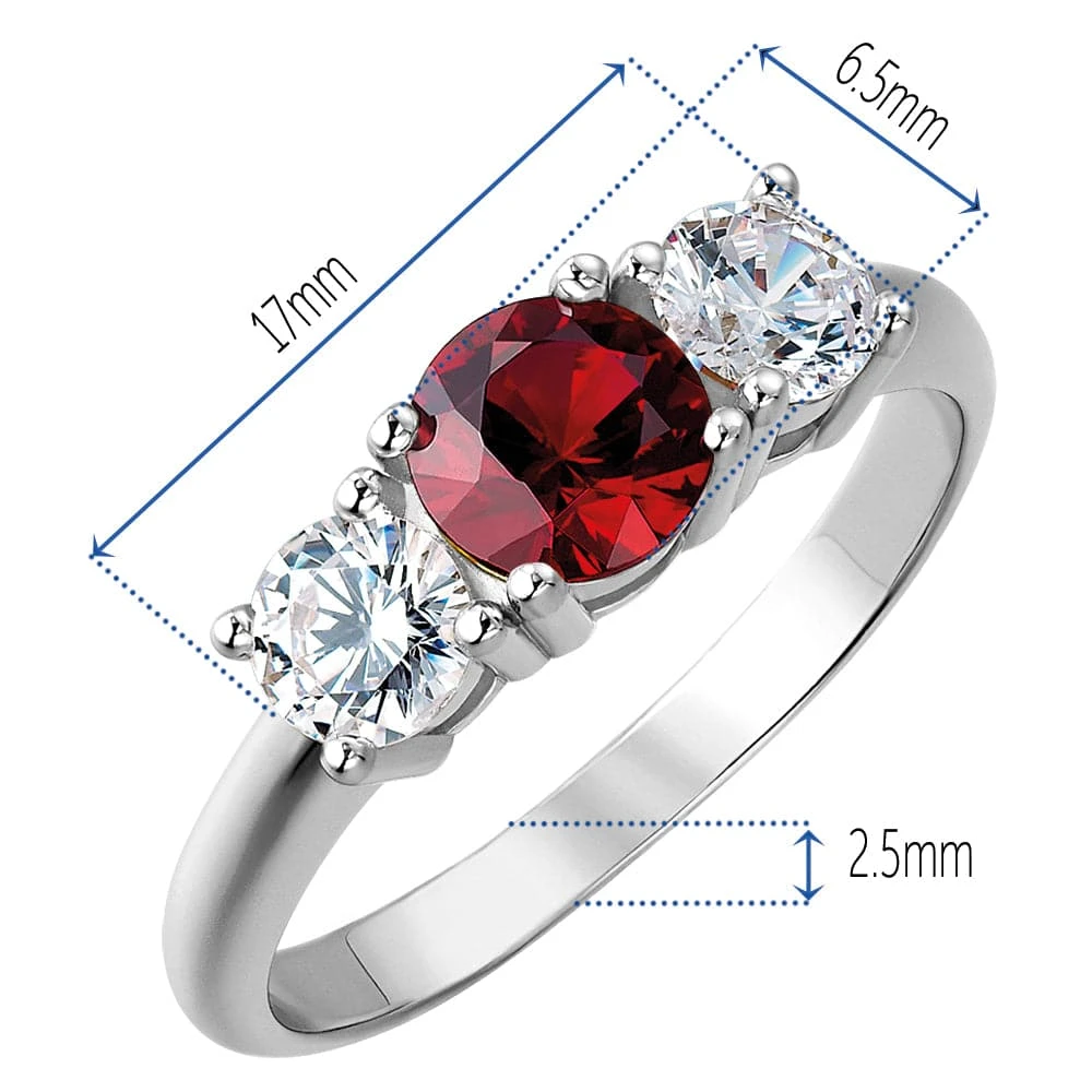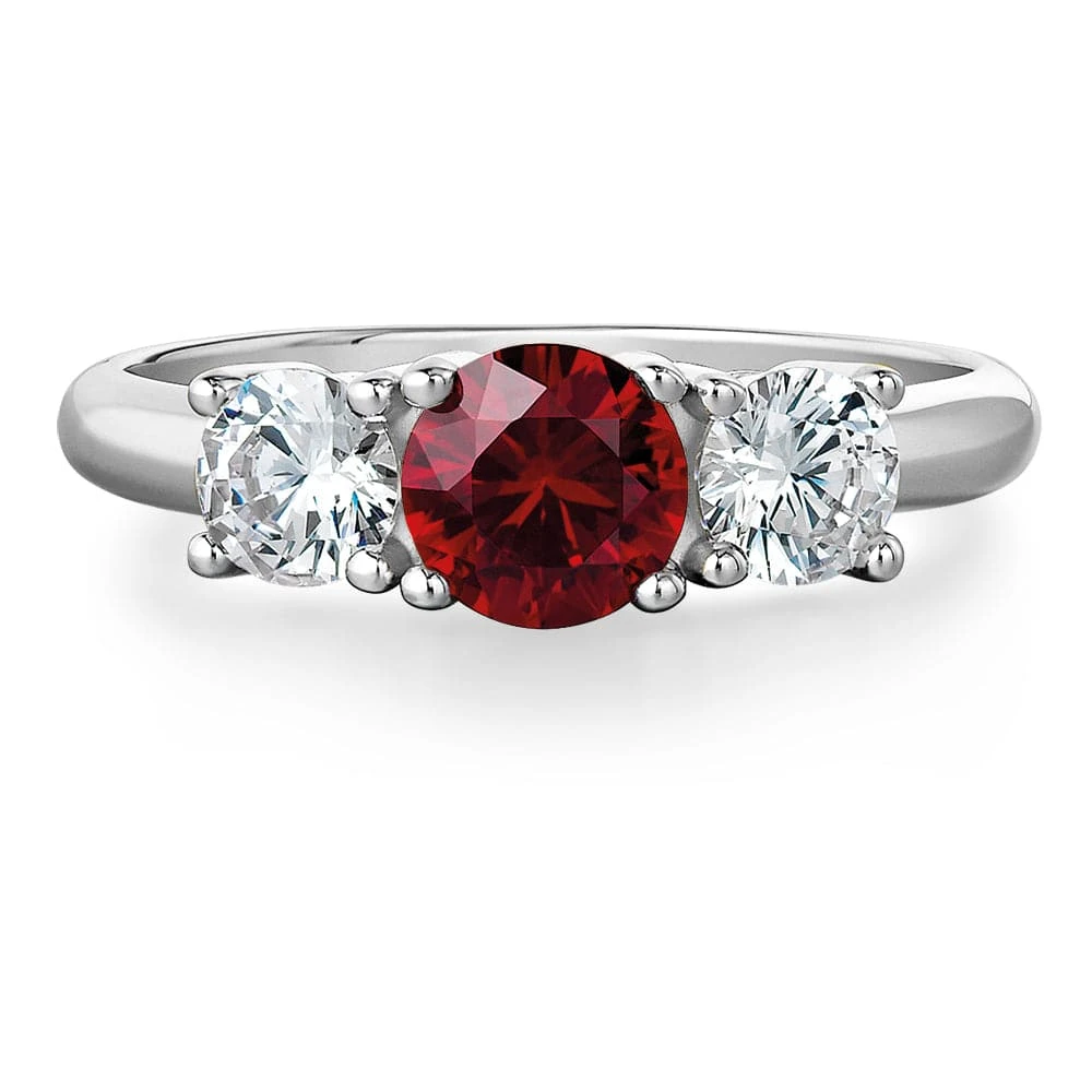 Set in a classic triple claw setting, our Ruby Trilogy Ring displays a 1 ct. Tru-Ruby gem flanked by two perfectly matching 0.5 carat round brilliant cut, ice white Tru Diamonds™ gems, making it a true testament to style. It’s an investment piece that is sure to bedazzle your friends at any event.