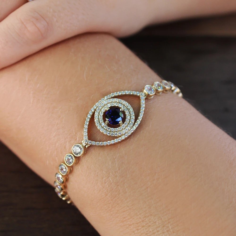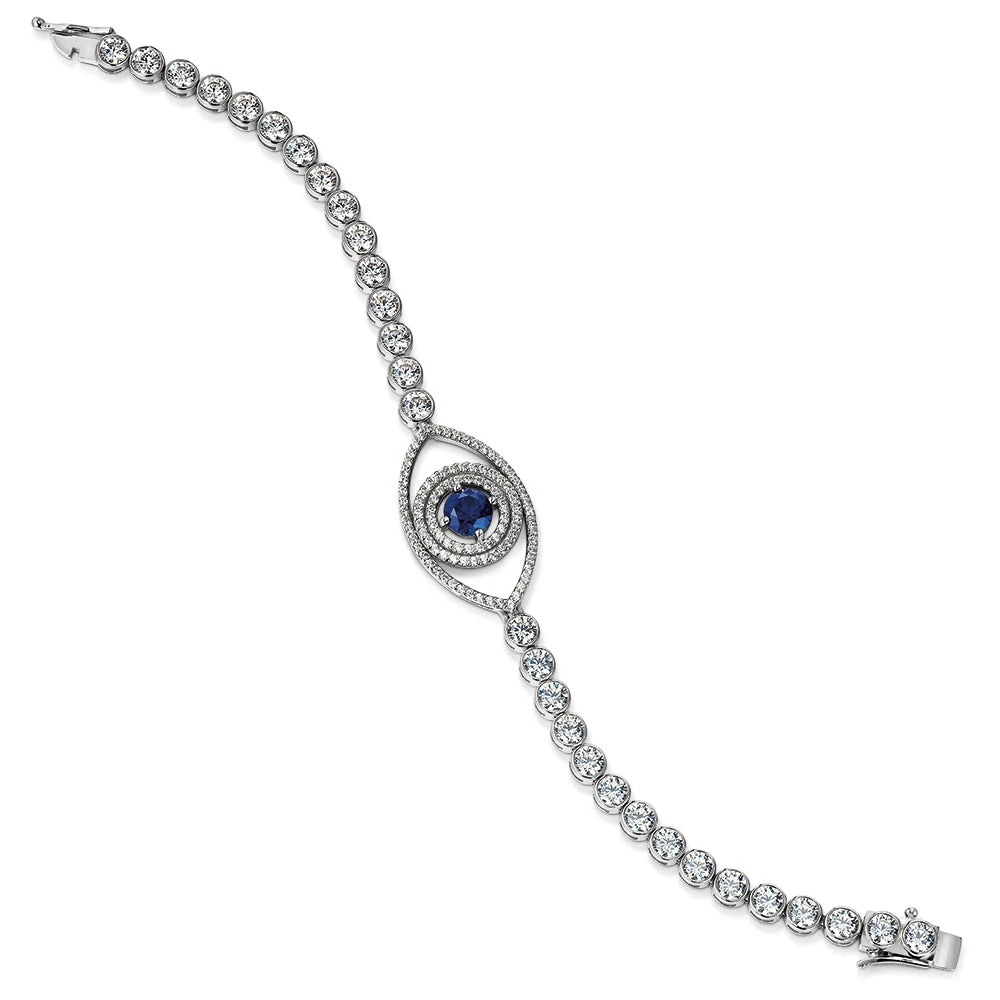 This eye-catching tennis bracelet features a Tru-Sapphire centre stone surrounded by two radiant halos of Tru-Diamonds. A luxurious piece that brings drama and brilliance to the wrist.